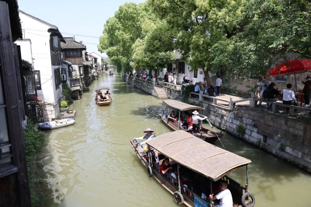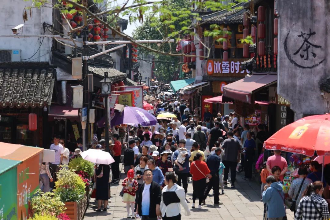 景区内游客摩肩接踵,天南地北的方言与沿街商铺的叫卖声、欢笑声共同谱就枫泾古镇“五一”欢快热闹的乐章。虽然景区人流量大,但秩序井然。停车场管理人员引导车辆有序停放,售票、检票工作细致高效,工作人员和志愿者们热情服务……大家统一协作、分工有序,带给游客舒心安心的旅游服务体验。
