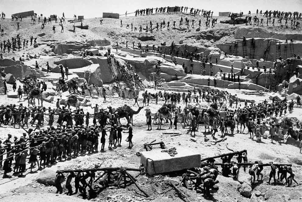 1905年,埃及马萨拉采石场,这里曾为胡夫金字塔提供石料。据推算,整座胡夫金字塔使用了大约230万块巨石,总质量可达约590万吨,平均每块石头重达2.5吨,最大的可达60吨,工匠们会在吉萨高原附近的采石场开采石头,通过尼罗河,用船运输现代学者推测,古代埃及人处理搭建金字塔内部石块方法比较简单,大约就是天然石面上敲打出凹槽插入木楔,然后用水浸泡木楔使其膨胀,从而崩裂石面,获得大块石料,然后加工成石块,放在木质或泥砖托板上用绳子拽至工地,有可能还会在路上铺上浇过水的细沙——考古工作者在第十二王朝的一位地方长官杰胡提霍特(Djehutihotep)墓中发现一幅壁画,描绘了一名男子正给巨石托板前沙子浇水的场景。除此之外,施工人员还将从图拉运来的白色石灰石精雕细琢,加工成纵剖面为直角梯形的石块——今日世人所见石头如阶梯般堆砌的胡夫金字塔并不是当年原貌,只是塔体内部石层,外部原本包裹着精加工过的白色石灰石,它们梯形斜角一侧向外,直角面同里面阶梯接触,让胡夫金字塔每侧都呈现出如镜面一般光滑的白色斜面。