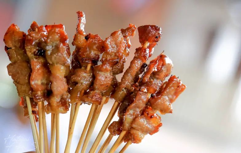 通常将猪肉、鸡肉提前用椰浆和酱料腌制,烤熟之后直接吃,没有辣椒面也没有孜然。整体味道偏甜,有点像加了很多蜂蜜的奥尔良烤肉,咸甜爱好者应该会很喜欢。