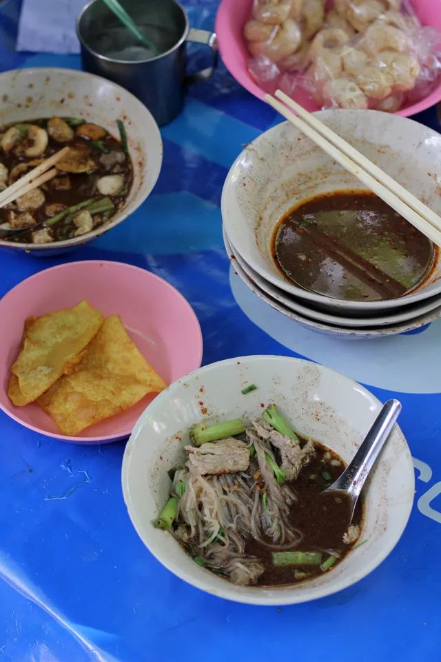 面条在泰语里叫“鬼叼”,据说是由潮汕的“粿条”发展而来,所以发音有点相似。而船面则多指小碗面,最早由水上市场的船家在船上售卖,为其它小贩提供正餐之间果腹的“加餐”。