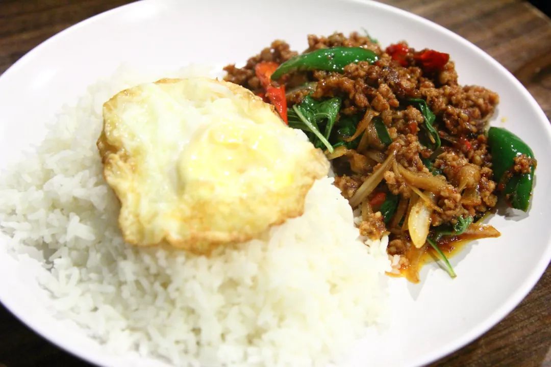 打抛猪肉饭算是泰国最常见的盖饭,无论是在泰国人家里,还是路边小摊,都一定有这道菜。制作方法也很简单,其实就是炒肉末——把猪肉剁成肉末,加上辣椒、洋葱、打抛叶、鱼露等炒制,再铺在刚煮好的泰国香米上。每一勺都浸满了味道,超级下饭!喜欢吃辣的小伙伴一定不能错过。