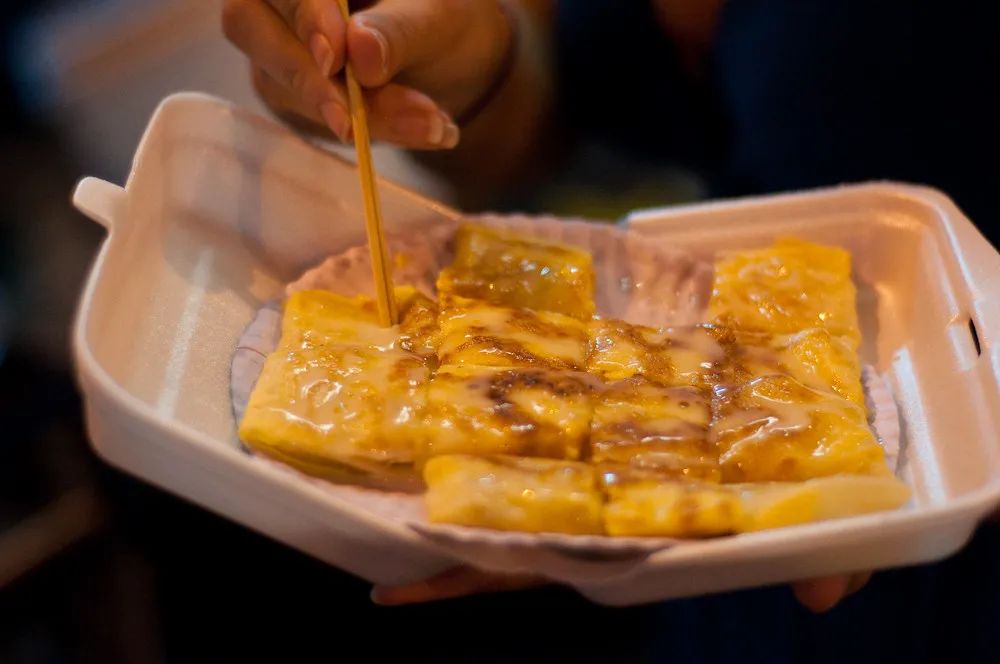 挤上炼乳和巧克力酱的香蕉煎饼 | flickr Brian Markham面粉和鸡蛋液摊成薄饼,再取整根香蕉切成薄片铺在上面,折成正方形煎得金黄酥脆,最后淋上巧克力酱和炼奶,想要多少就让老板放多少,泰国人完全不心疼!一口咬下去外酥里软,香蕉的轻微酸涩平衡了整体甜腻的口感。吃过之后不得不感叹,香蕉是最适合加热吃的水果了吧!