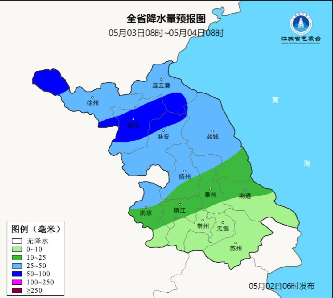 江苏气象天气预报显示:5月2日后期开始全省有一次明显降水过程,风力较大,给返程交通带来不利影响。5月3日至4日,沿江以北地区有大雨、局部暴雨。