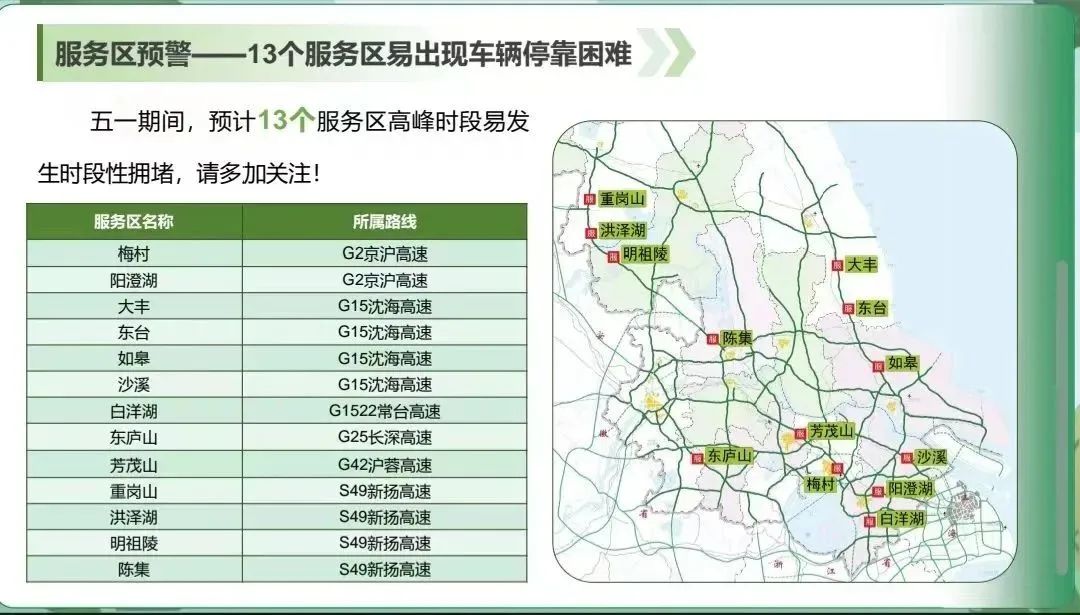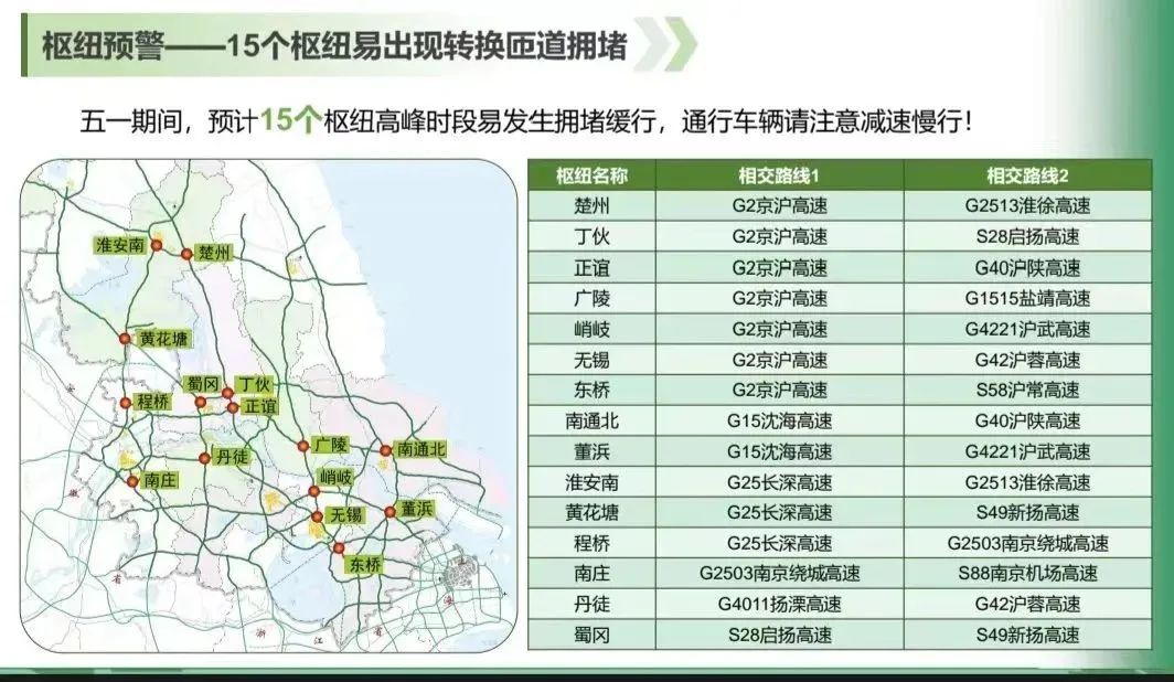 长深高速宋跳双向、宁海南京方向、灌云南南京方向、灌南南连云港方向;启扬高速江都北、扬州泰州机场、丁伙双向;沈海高速太仓东、太仓新区双向。