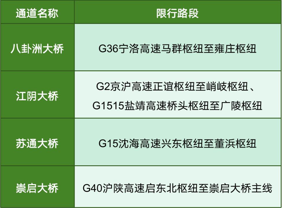 五一返程期间,八卦洲大桥、江阴大桥、苏通大桥、崇启大桥实施黄牌货车限时错峰出行政策,限行时段为5月2日和3日每日8时-22时,限行路段如下: