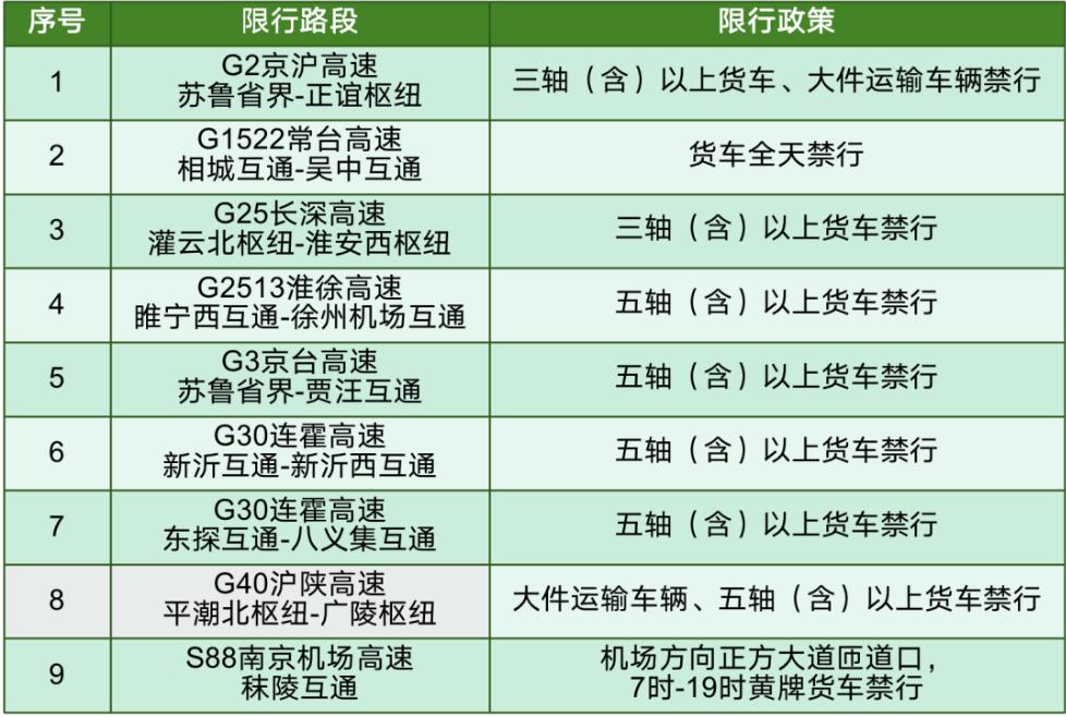 部分高速路段车辆限行返程期间,江苏高速对危化品运输车全路网全时段禁行。部分重要路段、节点实施交通管制政策,相关车辆假日期间请勿驶入限行路段: