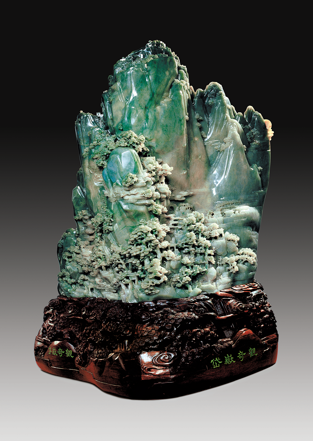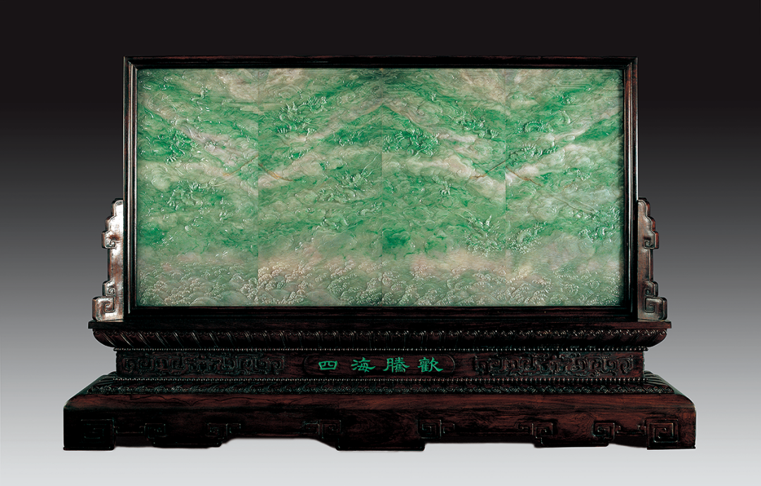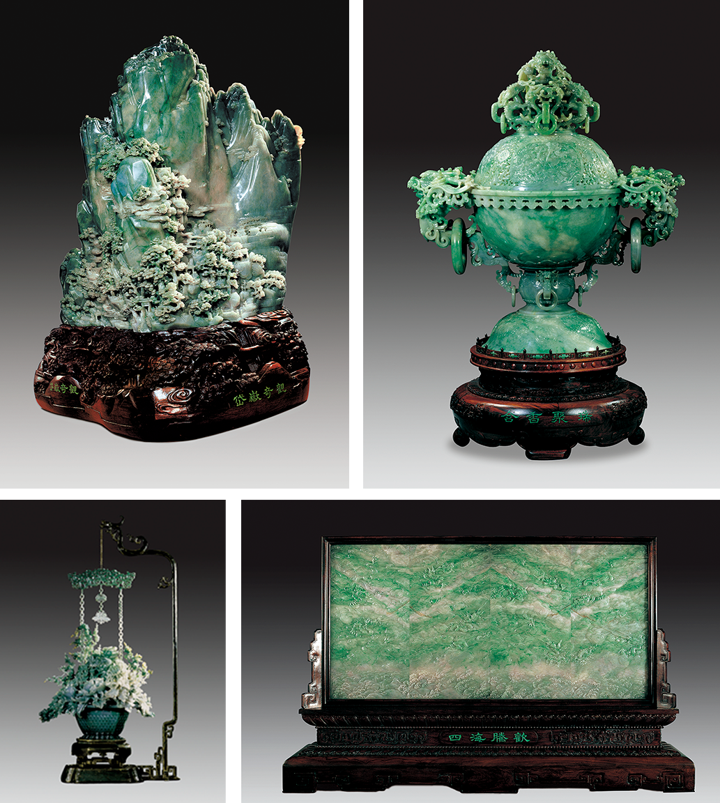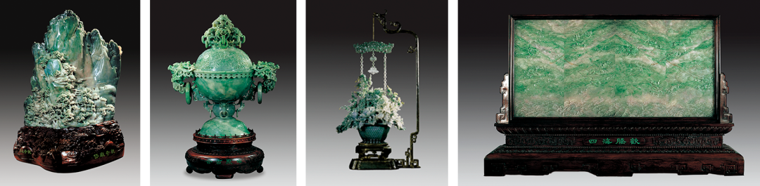 △翡翠山子《岱岳奇观》、翡翠花薰《含香聚瑞》、翡翠提梁花篮《群芳揽胜》、翡翠插屏《四海腾欢》