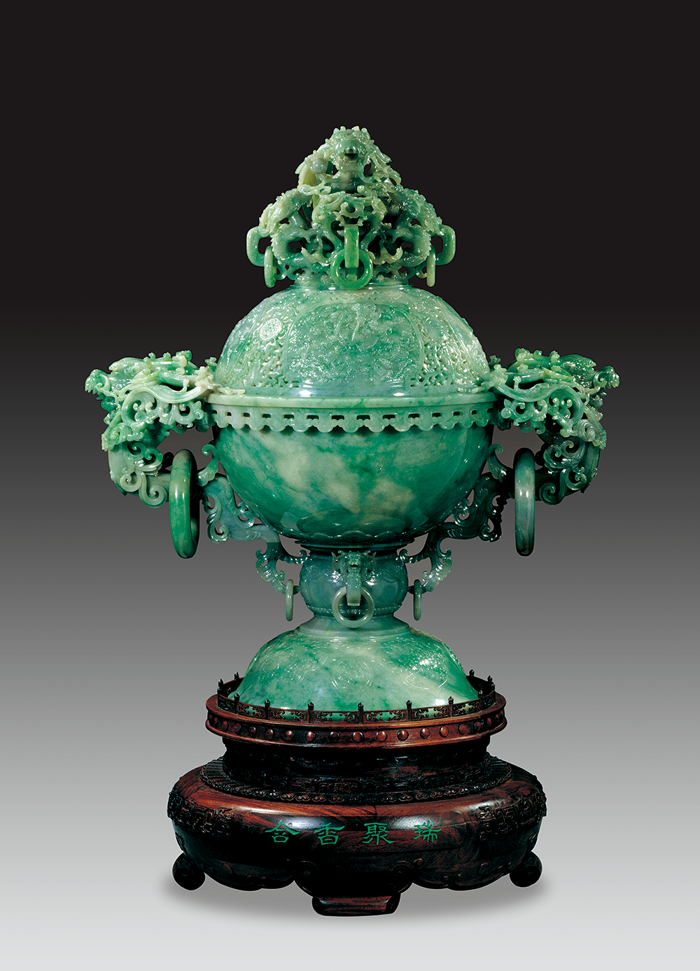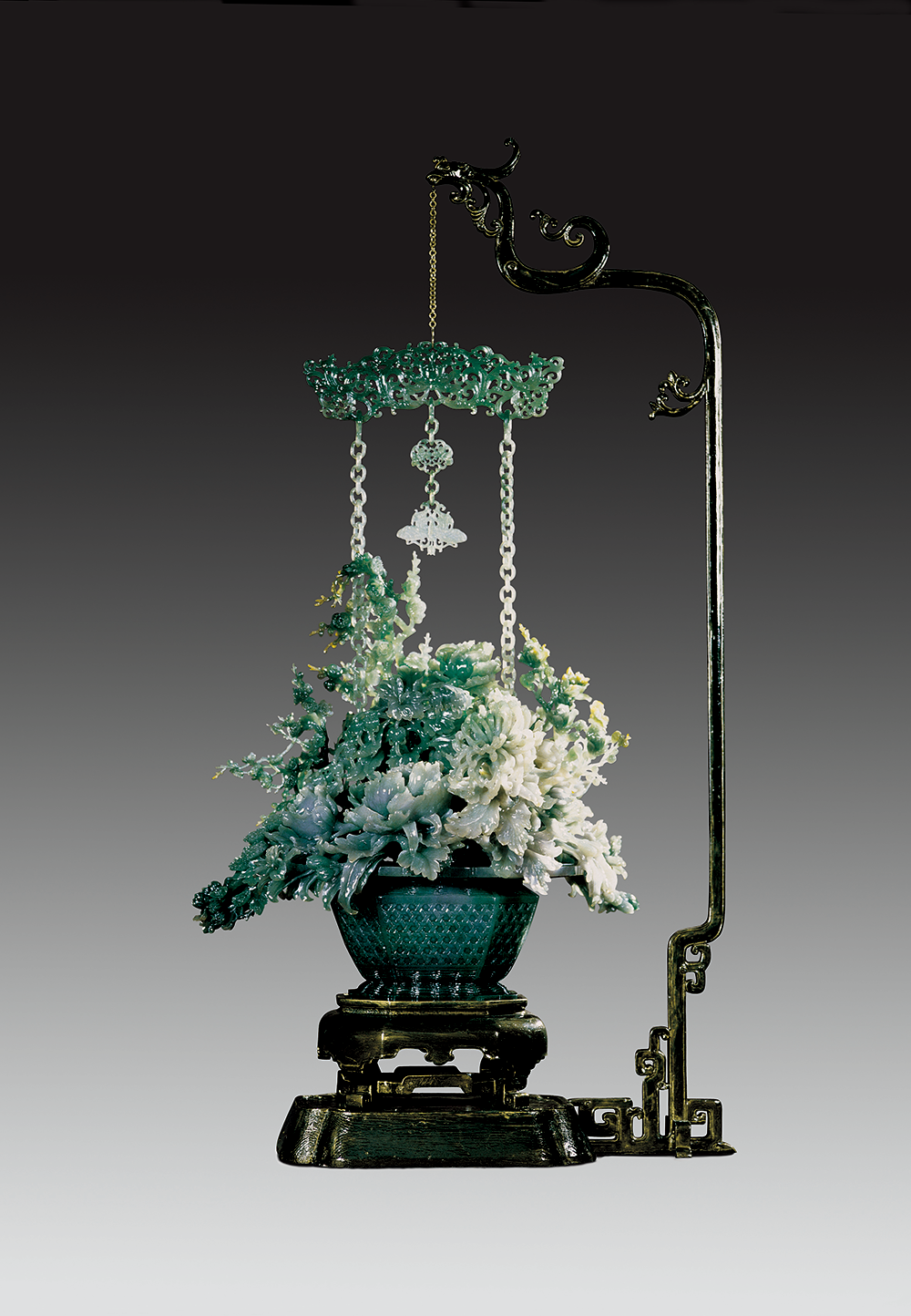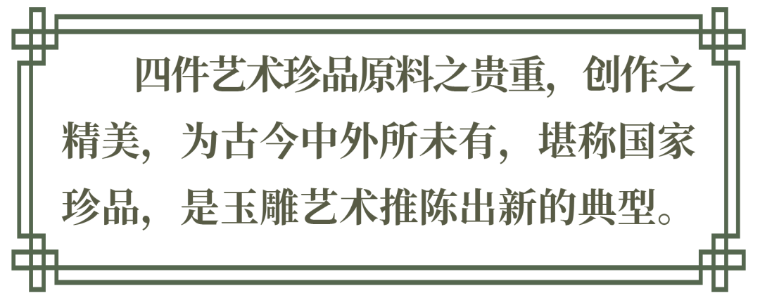 △翡翠山子《岱岳奇观》、翡翠花薰《含香聚瑞》、翡翠提梁花篮《群芳揽胜》、翡翠插屏《四海腾欢》