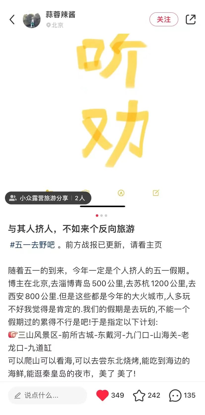 小红书用户@蒜蓉辣酱 一条名为#与其人挤人,不如来个反向旅游# 的笔记在五一假期临近前获得了近10万浏览,而他的粉丝甚至不足百人。