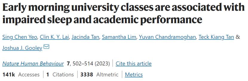 [1] Yeo S C, Lai C K Y, Tan J, et al. Early morning university classes are associated with impaired sleep and academic performance[J]. Nature Human Behaviour, 2023: 1-13.