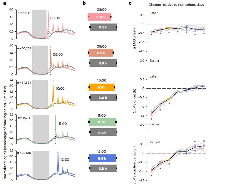 那缺课的这些人去干嘛了呢?是没起来吗?研究人员对39458名学生登陆管理系统的昼夜模式和181名学生的睡眠行为进行了评估,在早上8:00开始的课程中,有近三分之一的学生没有及时起床,但是这些学生并不是什么“逃课惯犯”,如果上课时间再晚一些,他们就很少在该上课的时间睡觉了。