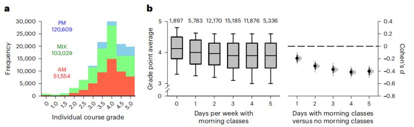 近期的《自然·人类行为》就发表了这样一篇研究[1]。来自新加坡国立大学杜克医学院的 Joshua J. Gooley及其团队利用近10万名新加坡大学生数据,发现早课越多,学生的出勤率越低,睡眠时间越短,学习成绩就越不容乐观。每周上早课的天数与平均绩点呈负相关。