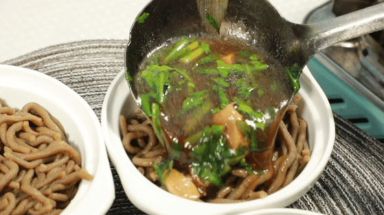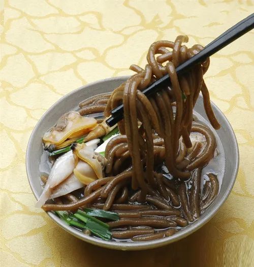 用地瓜磨成的面粉加盐和碱清水调出面团,揉至光滑拿出专用擦菜板,双臂双手用力,擦出细长的面条,上蒸箱蒸熟。利用十分钟的时间开一锅鱼卤,马面鱼处理干净,去除鱼皮内脏。热锅冷油,葱姜爆香,马面鱼过油微煎,去腥增鲜。开锅后,小火煮至鱼肉鱼骨分离,下入适量茼蒿,鱼卤就做好了。浇上鱼卤,鲜香四溢的鱼卤地瓜汤就完成了。
