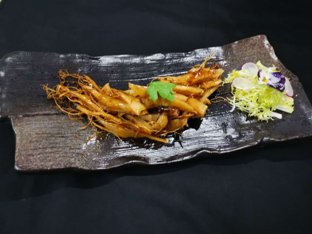 菜品色泽呈酱褐色,选用威海刺参和大葱为主料,海参清鲜,柔软香滑,葱段香浓,食后无余汁,是“古今八珍”之一。葱香味醇,营养丰富,滋肺补肾。