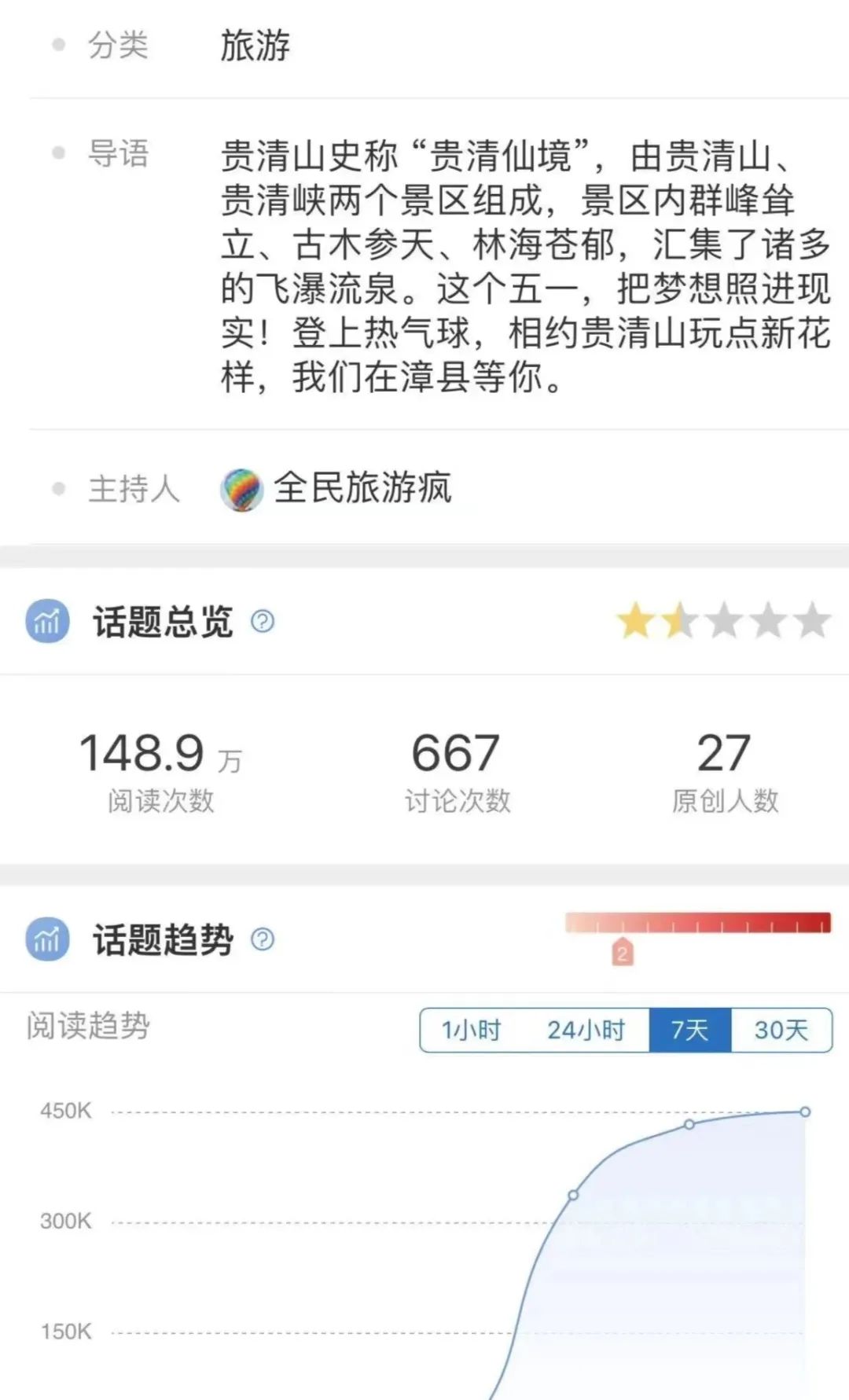 “贵清山可以玩热气球费控揽胜”“遇见贵清山遮阳山”等话题持续霸榜兰州等各大城市的同城热搜、百度APP、微博等平台。在优惠政策上,漳县政府制定出台“引客入漳”一揽子奖励政策21条,印制景区景点代金券1.2万份。贵清山景区、贵清山植物园景区强强联合,推出“29.9元畅游两大景区”套票,进一步带动全县旅游消费,推动旅游市场营销向线下线上并举转变。