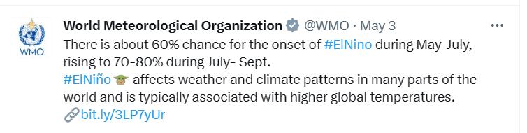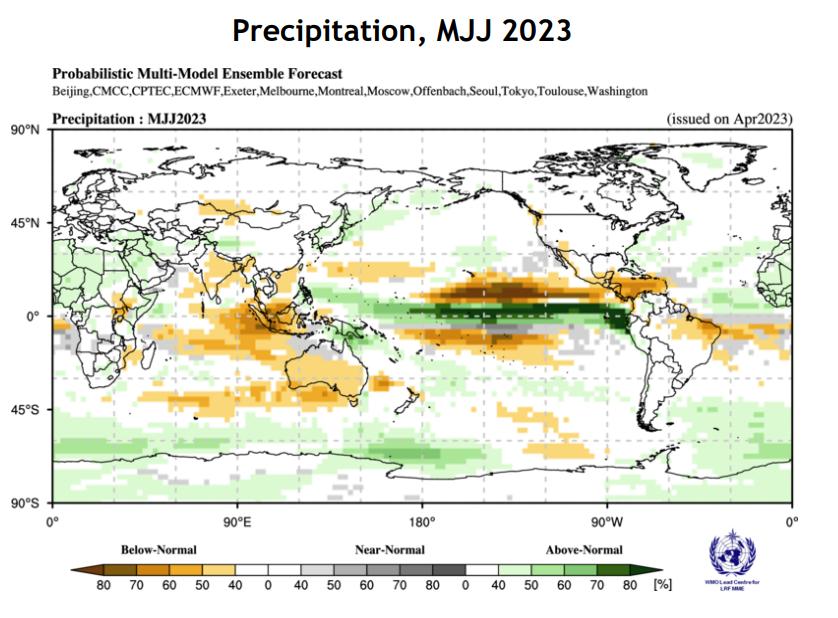 (注:WMO对2023年5-7月的地表温度预测)WMO认为全球在5月至7月出现厄尔尼诺现象的可能性为60%;在7月至9月间出现厄尔尼诺现象的可能性为70%-80%。