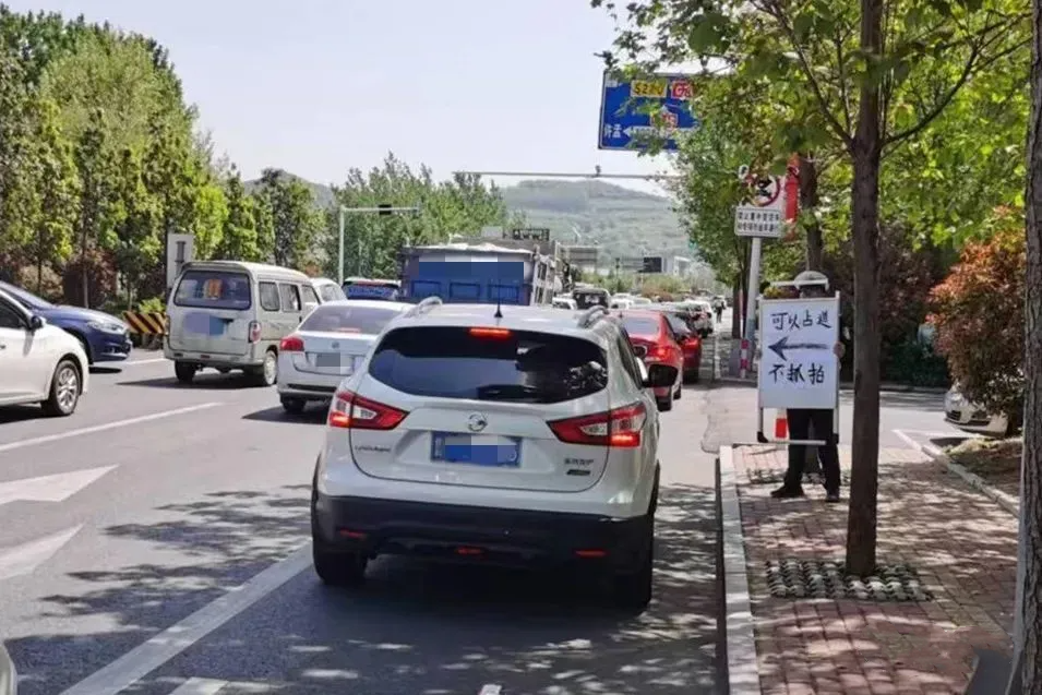在山东日照,假期流量增加,交警担心游客看不到指示牌,高举牌子指挥交通,牌子写道:可以占道,不抓拍。