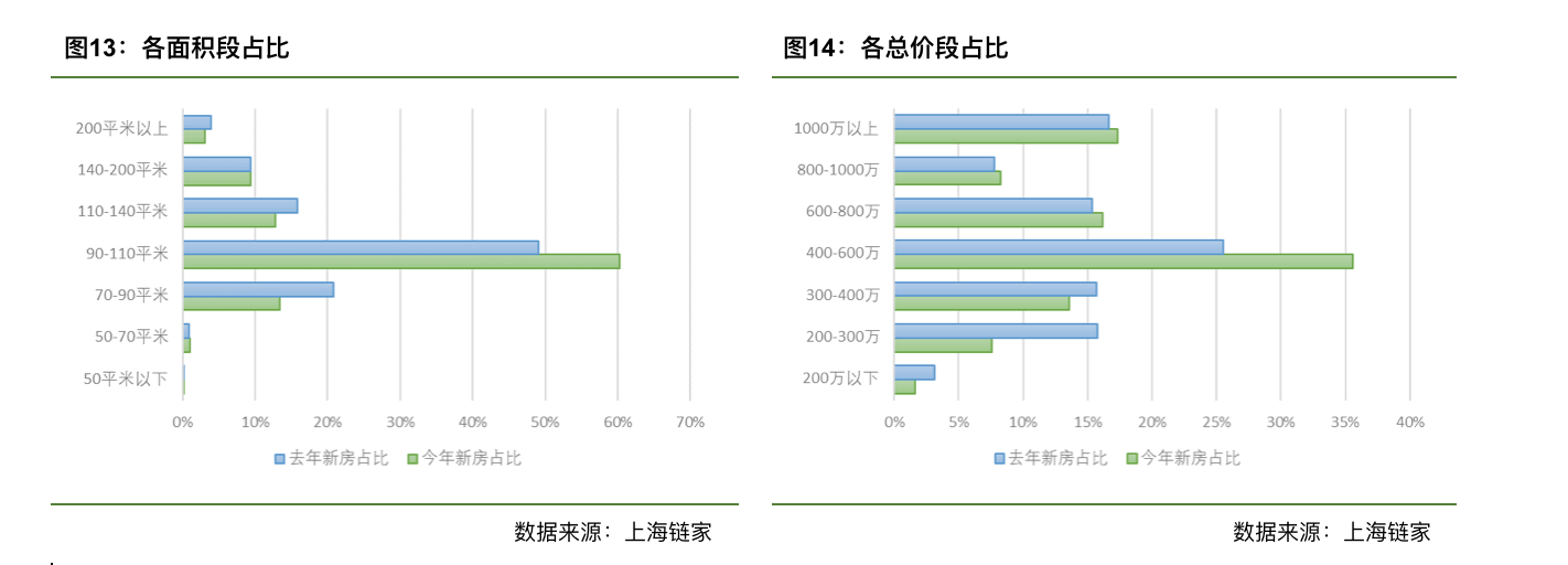 从总价段来看,400万-600万元的占比增加较为显著,占比达到36%,增加了10个百分点。400万元以下的占比下降,较去年减少了12个百分点。