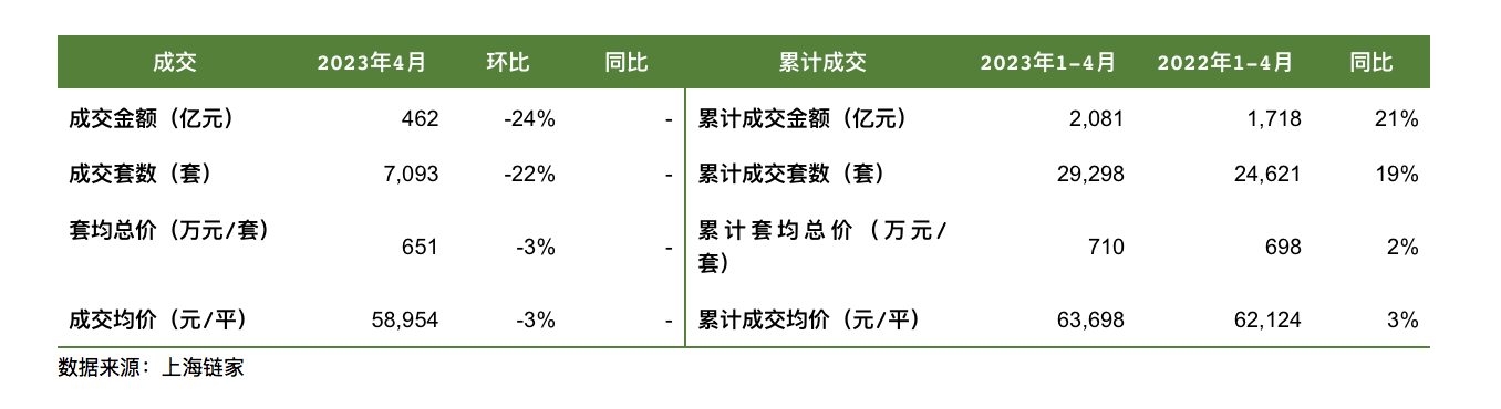5月5日,据上海链家研究院的监控数据显示,4月份,上海全市共成交新建商品房7093套,环比下降22%,成交金额462亿元,环比下降24%,套均总价651万元,环比下降3%,成交均价58954元/平方米,环比下降3%。