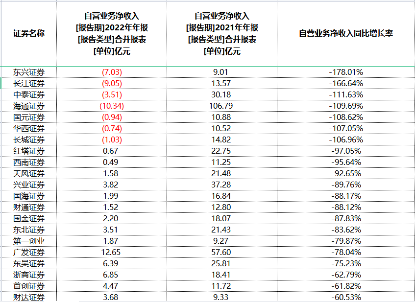自营业务净收入普遍下滑,海通证券、东兴证券、长江证券、中泰证券、长城证券、国元证券、华西证券7家券商自营业务净收入(自营业务净收入=投资收益-对联营企业和合营企业投资收益+公允价值变动收益)同比大幅转亏。