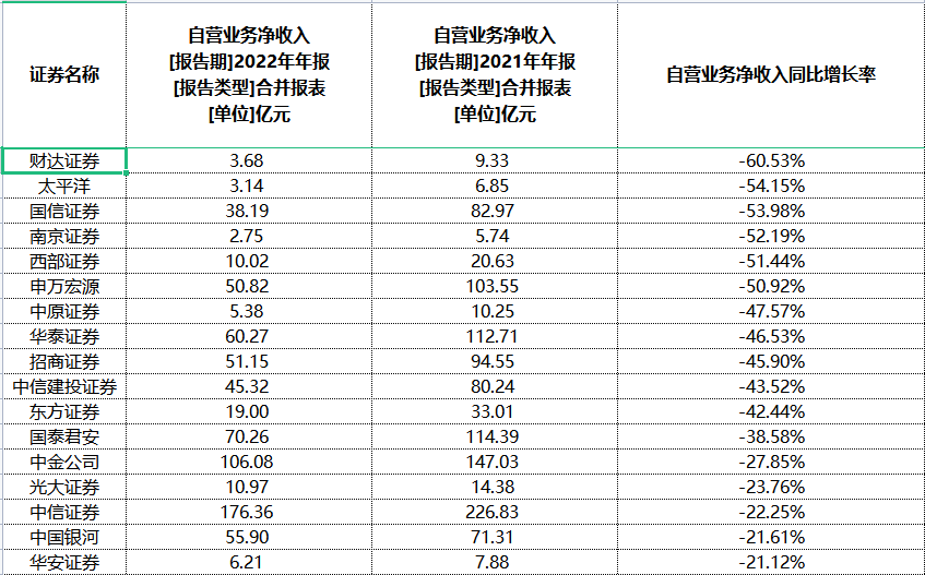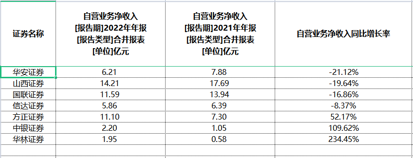 3家券商自营业务逆市增长,华林证券同比2021年大涨234.45%至1.95亿元,中银证券同比增约110%至2.2亿元,方正证券同比增长52.17%至11.1亿元。