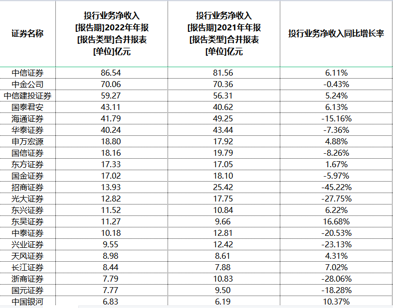 投行业务向龙头集中,且头部券商这一业务板块的业绩相对较稳。中信证券、中信建投、国泰君安去年投行业务净收入同比微增,中金公司、海通证券、华泰证券略有下滑。