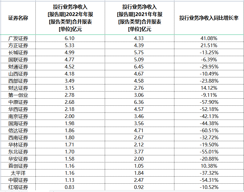 信达证券、中原证券、东北证券、中银证券、华西证券投行业务净收入同比下滑幅度超过50%。其中,信达证券投行业务净收入同比下降60.51%至1.86亿元,主要是因为整体经济环境影响和自身证券承销规模降低所致。
