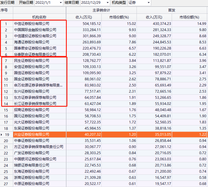 作为主承销商,券商承销收入排名呈现“强者愈强”态势,中信证券、中金公司、中信建投、海通证券、国泰君安、华泰证券6家市场份额总计达54.6%,民生证券、安信证券、国金证券、东兴证券、东方证券、长江证券6家中小券商凭借自身特色竞争力挤进前列,市场份额也近16%。而大多数券商的市场份额所剩无几。