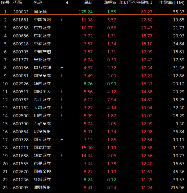 具体来看,截至5月4日,券商概念股同花顺股价年内大涨80.27%,东方证券年内涨22.5%,华西证券、东北证券、兴业证券、中泰证券等券商涨幅超过15%。但广发证券、东方财富年内微跌,首创证券年内跌22.68%,国联证券跌8.98%。