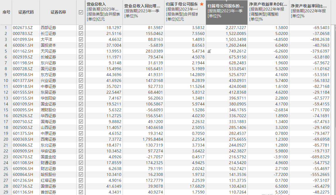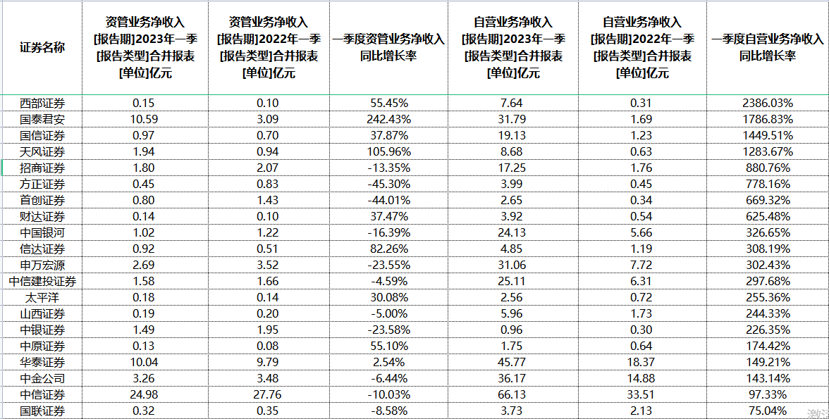 得益于2023年股债市场的回暖,券商自营投资业绩修复。今年第一季度券商业绩“起跳”,51家券商概念上市机构中有49家归母净利润同比增长,其中29家增幅超过100%,西部证券、长江证券、太平洋更是增逾1000%,主要原因是一季度资本市场表现平稳,证券投资业务收入增加显著。
