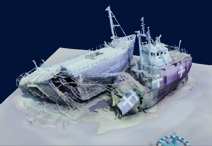 在公开的“快沉”测试视频中明显看到船体被掀起,船体断为两半。下面这幅图为使用3D水下成像系统创建的靶船残骸视图。以往这般对水面舰艇水线以下的“断舰”毁伤,往往只有鱼雷才能做得到——既往,鱼雷被认为是对敌舰最具毁伤、最有效的手段,特别是重型鱼雷。
