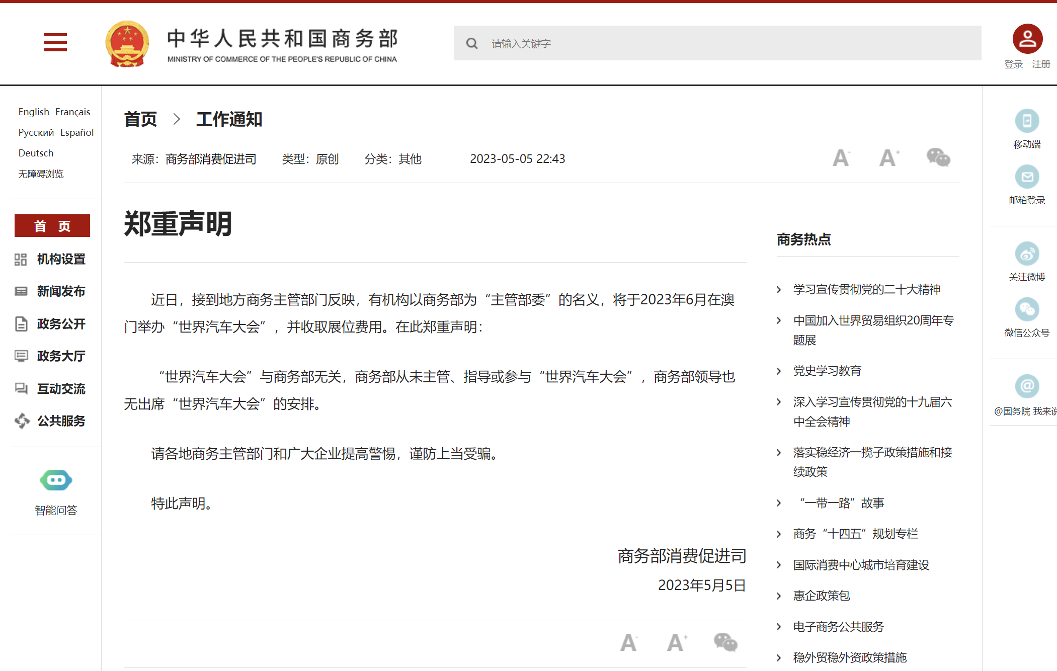 近日,接到地方商务主管部门反映,有机构以商务部为“主管部委”的名义,将于2023年6月在澳门举办“世界汽车大会”,并收取展位费用。在此郑重声明: