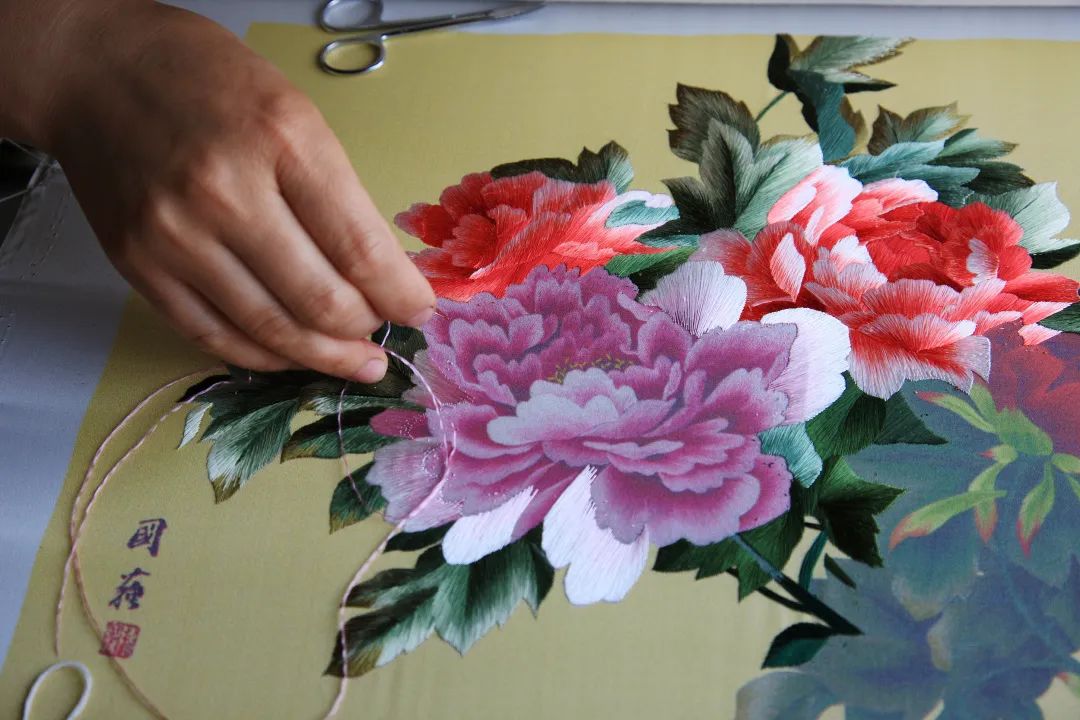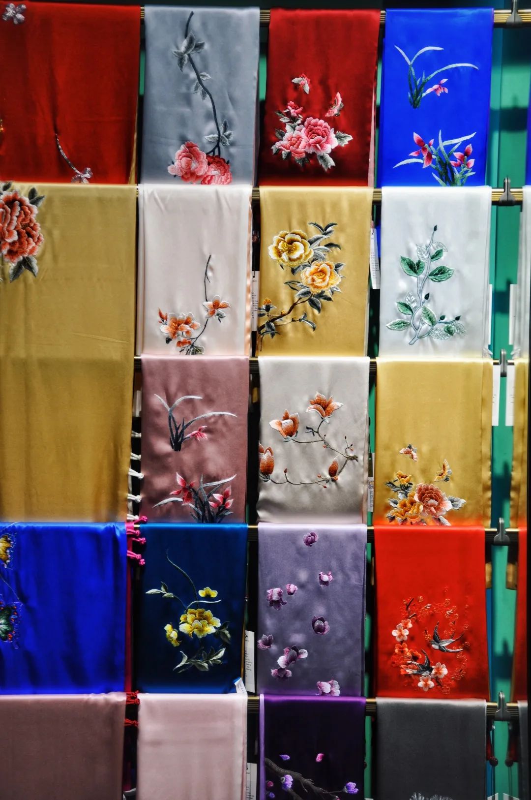 苏州山塘街上,一家丝绸商店里手艺人正在现场展示刺绣技法 / 图虫创意平,乃是苏绣中的基础之道。要绣出精致的苏绣,绣面须平整无暇,不容褶皱。一针、一线、一绣面,都要平整熨贴。即便是繁复的花草,也能借助叠瓣之法,在绣布上层层叠绣,使得叶片和花瓣平滑完整,再加上巧妙的颜色渲染,整体则更为华丽秀美。