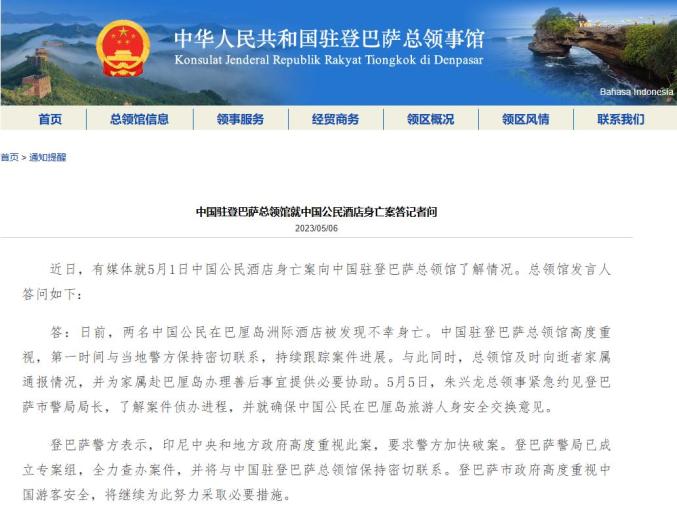 据中国驻登巴萨总领事馆网站5月6日消息,中国驻登巴萨总领馆就中国公民酒店身亡案答记者问: