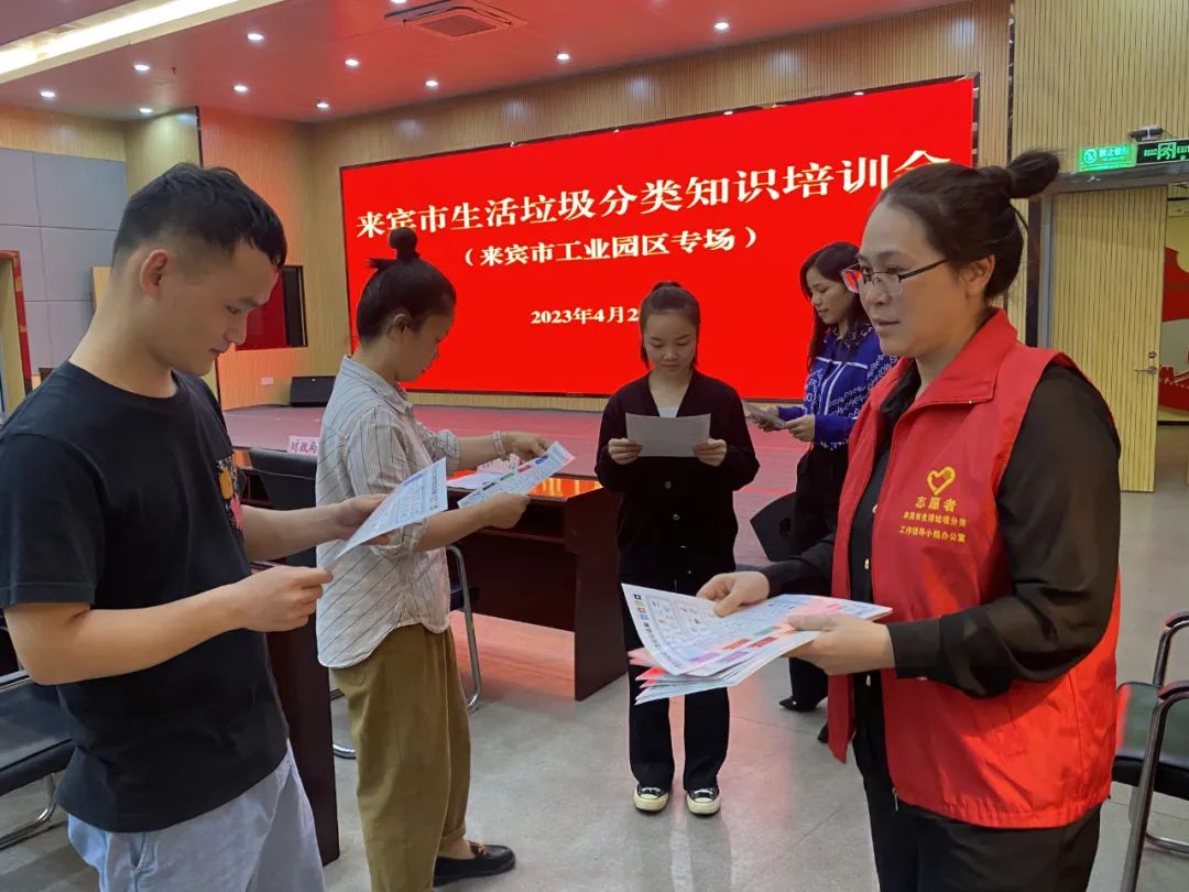 现场工作人员发放垃圾分类宣传册.“企业绿色环保发展离不开正确垃圾分类,我们要积极把垃圾分类融入日常工作中,践行环保理念。”广西来宾国鼎食品有限公司覃先生表示。