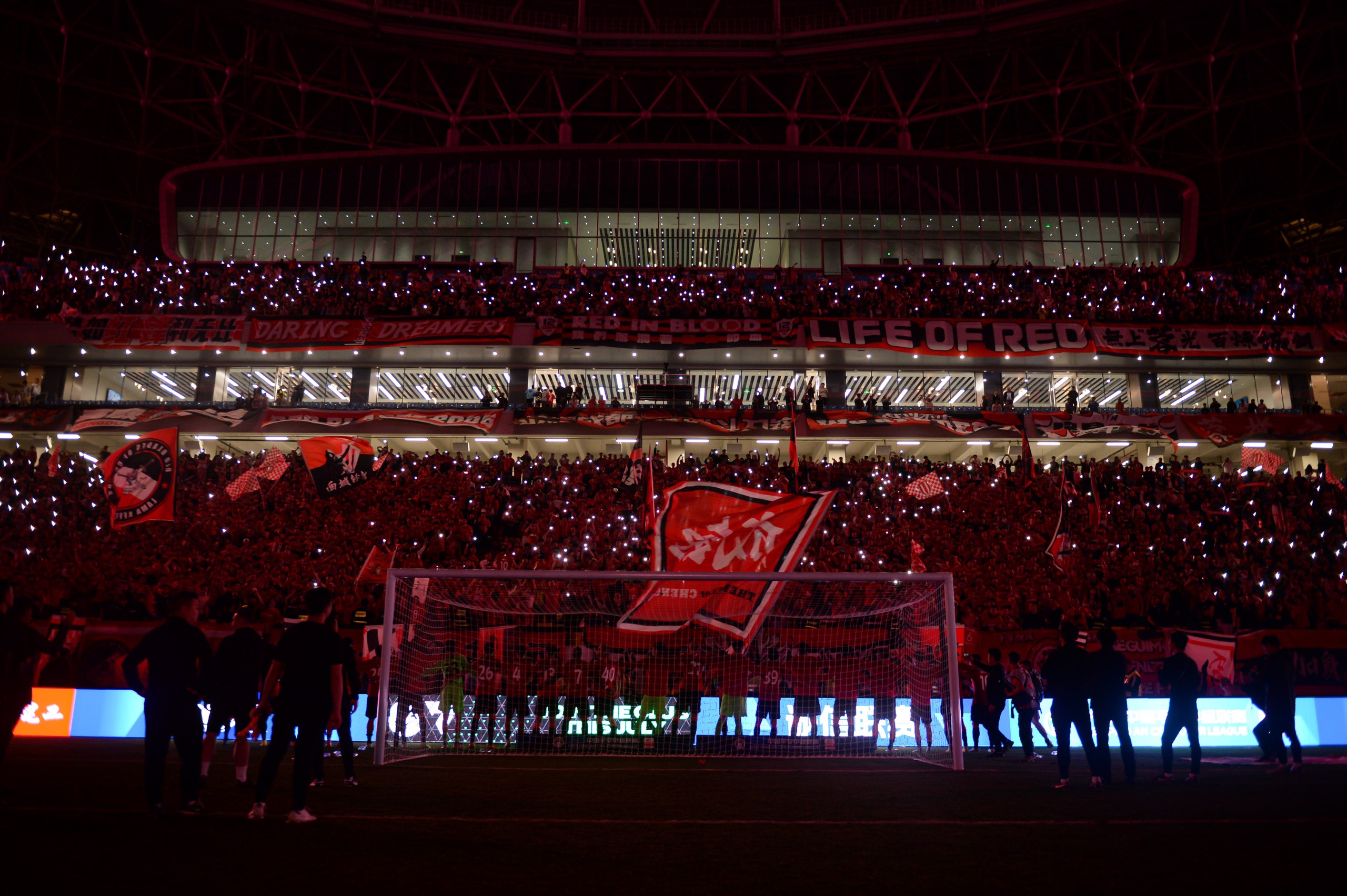 成都蓉城球迷用手机灯光点亮看台。