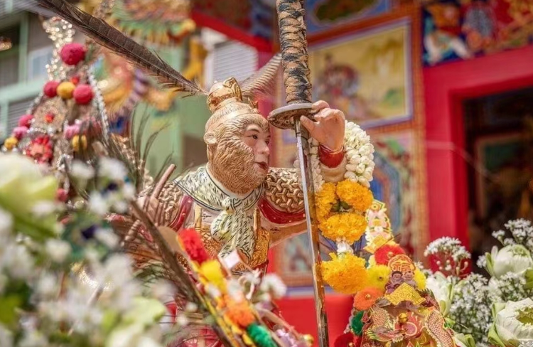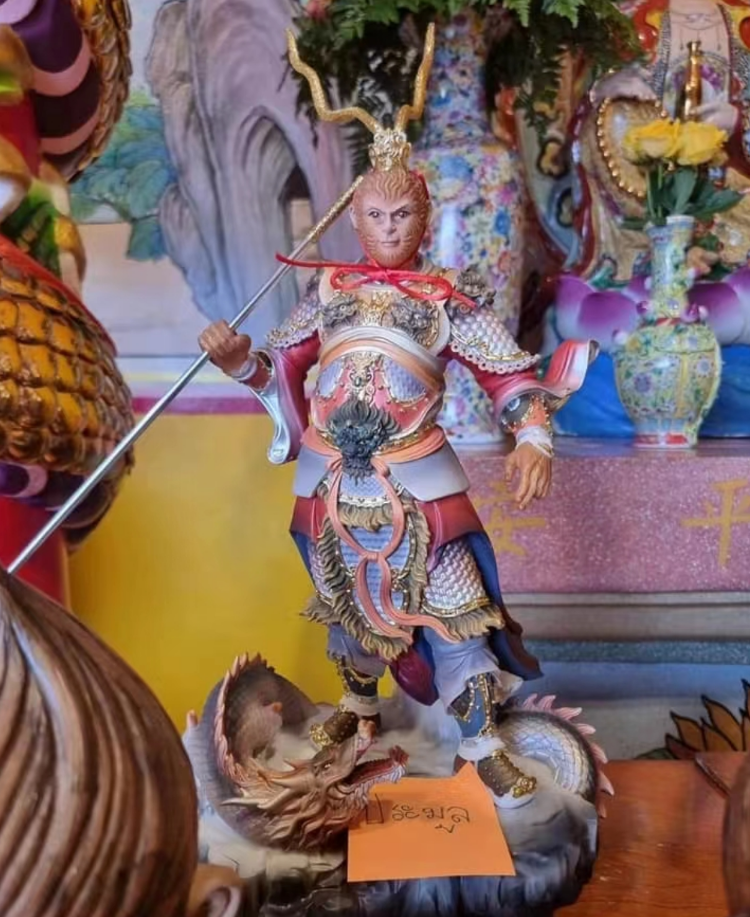 在泰国,《西游记》影片引进后多以诙谐幽默的配音出圈。当地电影院的配音员经常穿插泰语口语,谐趣横生,赢得广大泰国群众喜爱。因此泰国民间,也就逐渐有了多种《西游记》相关元素的衍生产品。如戏剧艺术、工艺品、口头艺术与壁画。在寺庙举办的庙会或在“百年市场”中能看到如唐僧、孙悟空、猪八戒、沙和尚等人物面具和金箍棒等工艺品。此外,泰国是东南亚在寺庙祭拜孙悟空的盛行之地,全泰国的孙悟空寺庙有五十余座。