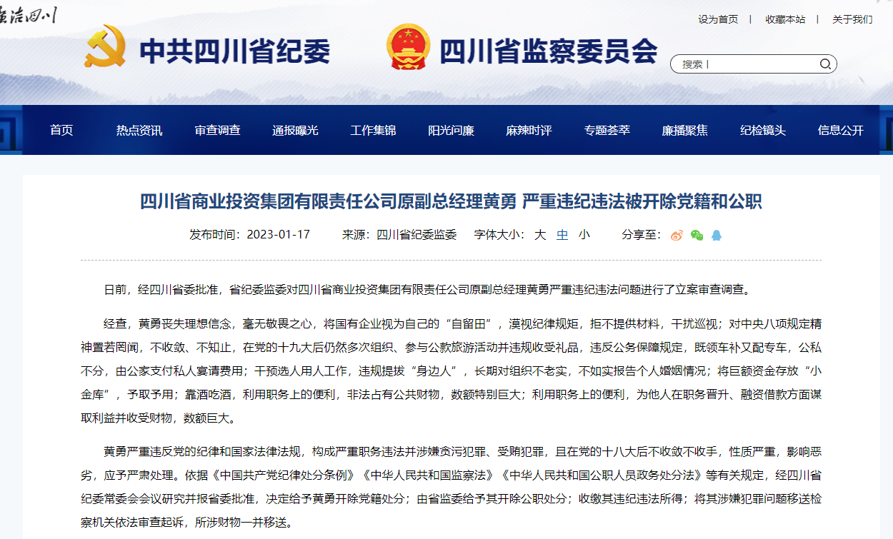 据悉,此前的1月17日,四川省纪委监委通报,四川省商业投资集团有限责任公司原副总经理黄勇严重违纪违法被开除党籍和公职。日前,经四川省委批准,省纪委监委对四川省商业投资集团有限责任公司原副总经理黄勇严重违纪违法问题进行了立案审查调查。