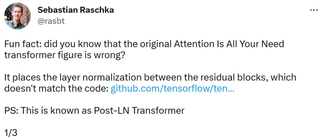 发现错误的是一位知名机器学习与 AI 研究者、初创公司 Lightning AI 的首席 AI 教育家 Sebastian Raschka。他指出,原始 Transformer 论文中的架构图有误,将层归一化(LN)放置在了残差块之间,而这与代码不一致。