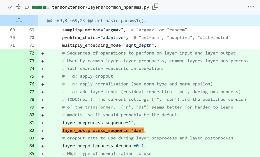 不一致的代码部分如下,其中 82 行写了执行顺序「layer_postprocess_sequence="dan"」,表示后处理依次执行 dropout、residual_add 和 layer_norm。如果上图左中的 add&norm 理解为:add 在 norm 上面,即先 norm 再 add,那确实代码和图不一致。