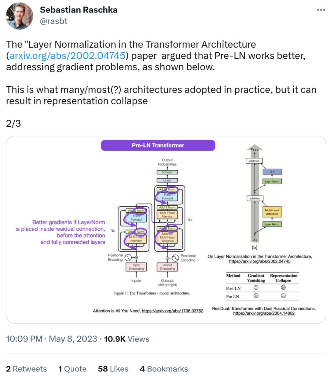 接下来,Sebastian 又表示,论文《On Layer Normalization in the Transformer Architecture》认为 Pre-LN 表现更好,能够解决梯度问题。这是很多或者大多数架构在实践中所采用的,但它可能导致表示崩溃。
