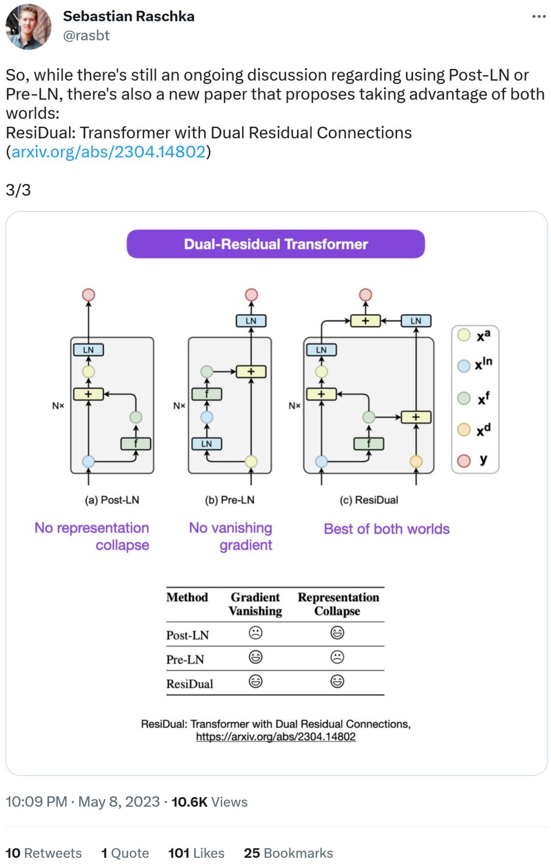 因此,虽然关于 Post-LN 或 Pre-LN 的争论仍在继续,但另一篇论文结合了这两点,即《ResiDual: Transformer with Dual Residual Connections》[2]。