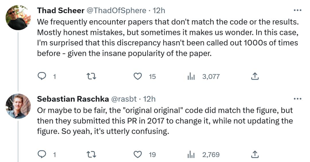 对于 Sebastian 的这一发现,有人认为,我们经常会遇到与代码或结果不一致的论文。大多数是无心之过,但有时令人感到奇怪。考虑到 Transformer 论文的流行程度,这个不一致问题早就应该被提及 1000 次。Sebastian 回答称,公平地讲,「最最原始」的代码确实与架构图一致,但 2017 年提交的代码版本进行了修改,同时没有更新架构图。所以,这实在令人困惑。