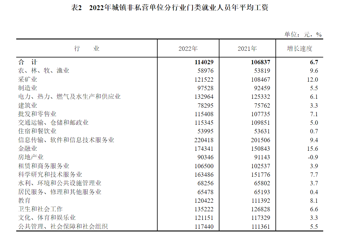2022年城镇非私营单位分行业门类就业人员年平均工资。来源:国家统计局