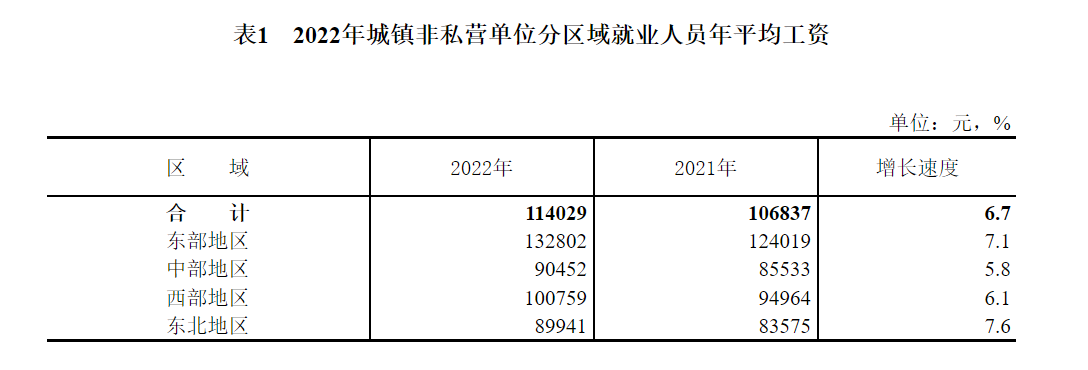 2022年城镇非私营单位分区域就业人员年平均工资。来源:国家统计局