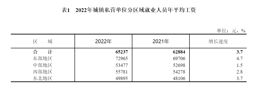 2022年城镇私营单位分区域就业人员年平均工资。来源:国家统计局