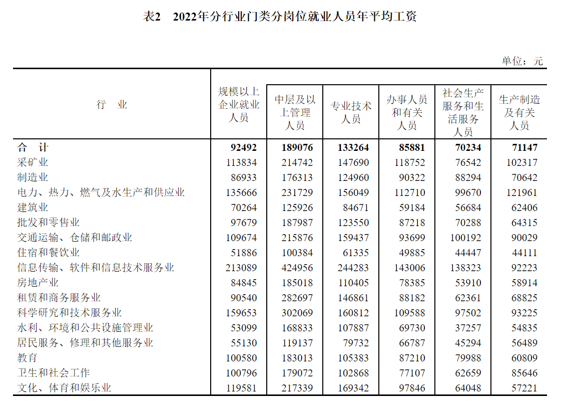 2022年分行业门类分岗位就业人员年平均工资。来源:国家统计局