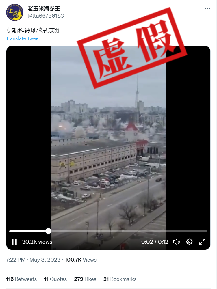 5月8日,推特用户@lla66750153发布一段时长12秒的视频,配文声称“莫斯科被地毯式轰炸”。视频中的画面显示一建筑物在炮弹的袭击下硝烟四起。