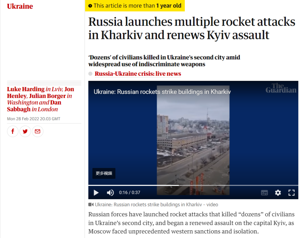 使用Invid软件截取视频关键帧进行反搜,可以发现,该视频实际拍摄于2022年2月28日俄乌冲突爆发初期,俄罗斯军队向乌克兰第二大城市哈尔科夫发动袭击。