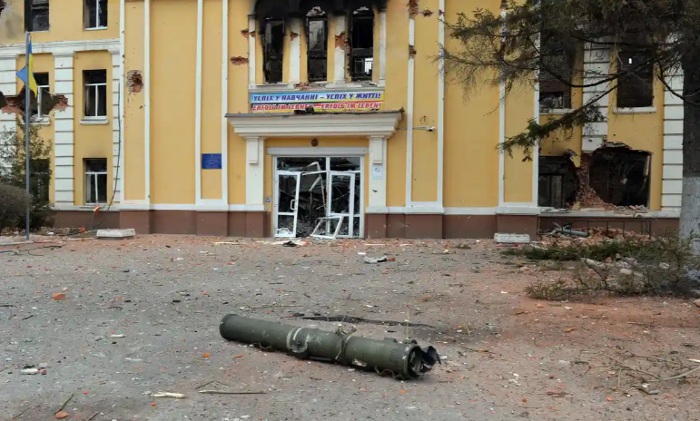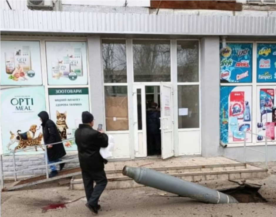 乌克兰哈尔科夫一家商店外的一枚残落的俄罗斯火箭弹。来源:每日邮报